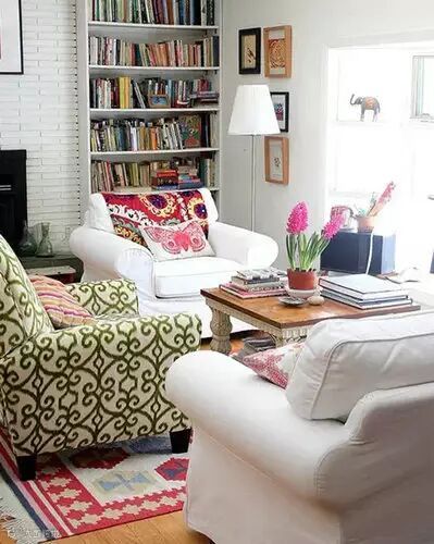两张白色沙发,搭配一张有图案有颜色的单人沙发,一下子有了视觉重心。