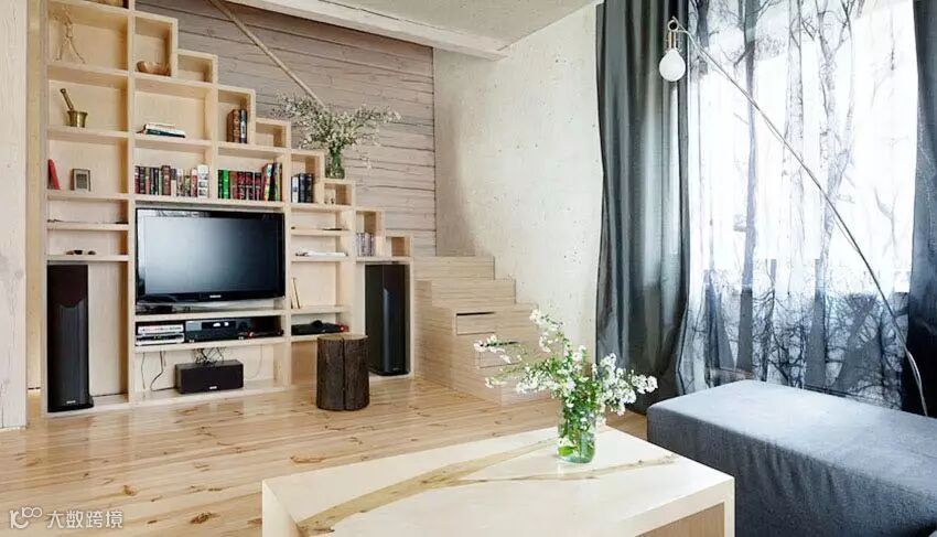 楼梯下的空间打造成兼具收纳与视听功能的电视背景墙