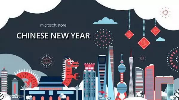中国新年越来越全球化,外国人也热衷于凑热闹感受中国新年气氛。今年羊年,微软自2015年2月12日至2月22日,所有国家所在的微软专卖店皆为巨幅中国新年元素背景,其长度横跨整个微软商店。背景中,左墙与右墙分别为中国历史建筑和现代城市,形成巧妙碰撞并体现历史感。同时,图中遍布生肖羊、中国龙、鞭炮等新年喜庆元素。