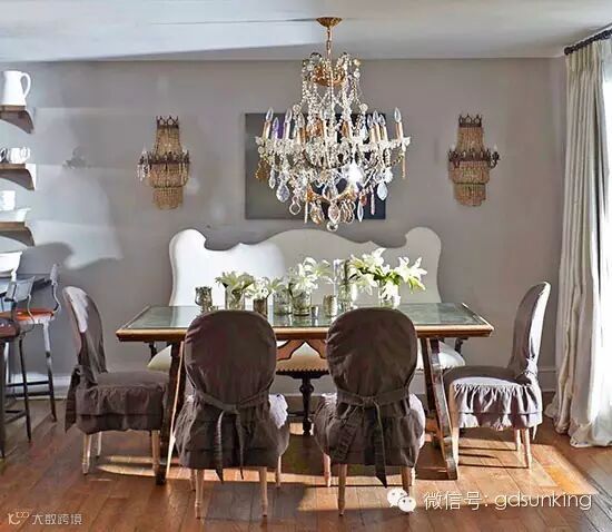 优雅的餐厅虽然餐厅和客厅的空间没有隔开,但是为了保持就餐空间的亲密感,餐厅的吊顶并不高。仿古的餐桌周围放着无扶手椅,餐桌靠墙的一面放的是一张多功能长凳。 ![]()