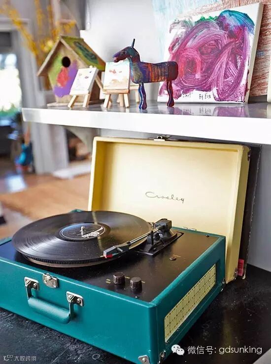厨房里色彩缤纷的纪念品一个克罗斯利的手提式电唱盘和福克斯六岁时画的画让这个灰色的厨房有它的特别之处。 ![]()