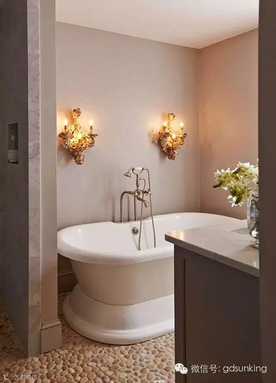 壁灯照亮了浴缸和鹅卵石地砖。