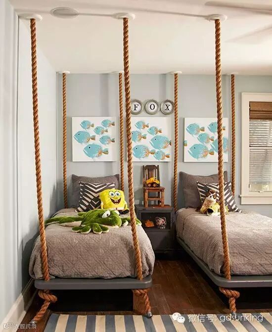 异想天开的儿童房卧室是一个六岁孩子的梦境:两张定制的床看上去像是被粗绳子吊起来,实际上床下有平台支撑。床头鱼的艺术画让房间充满孩童气息 ![]()