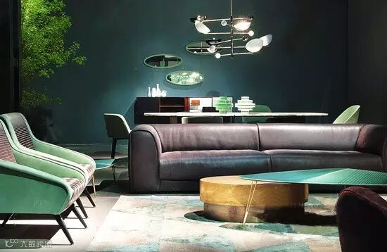 ◆蒂芙尼绿+金。蒂芙尼绿色的墙面承托出Art Deco的基调,深棕色皮沙发压衬,让空间氛围大方稳重,金铜色色茶几和吊灯的勾勒让空间增添精致细节,经特殊的印染处理后Baxter的手扶椅有了更多色彩。