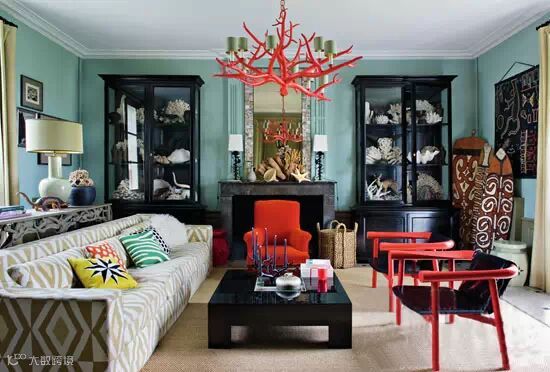 ◆别具风情的珊瑚吊灯。天马行空的珊瑚吊灯带来海洋的气息,映射出主人的独特喜好。娇艳的珊瑚红与单人沙发和太师椅呼应,成为冷色调中的一笔亮色。
