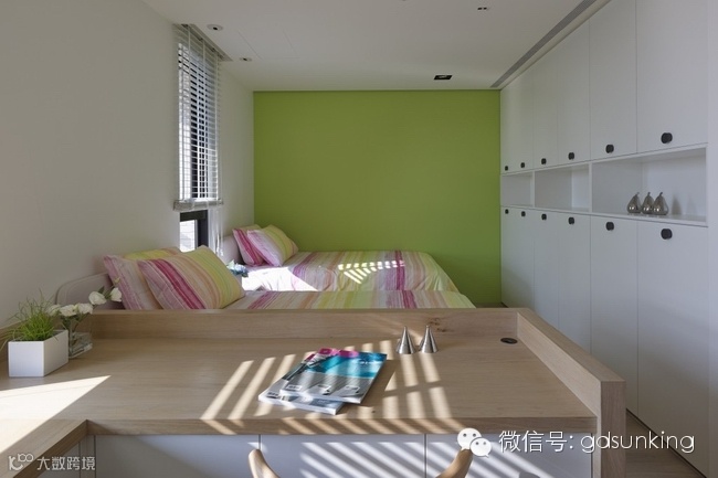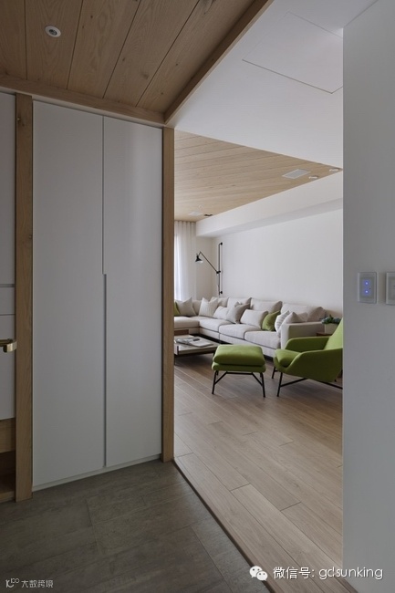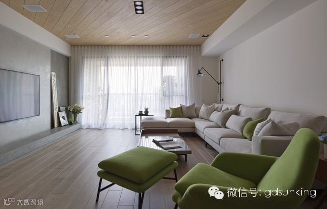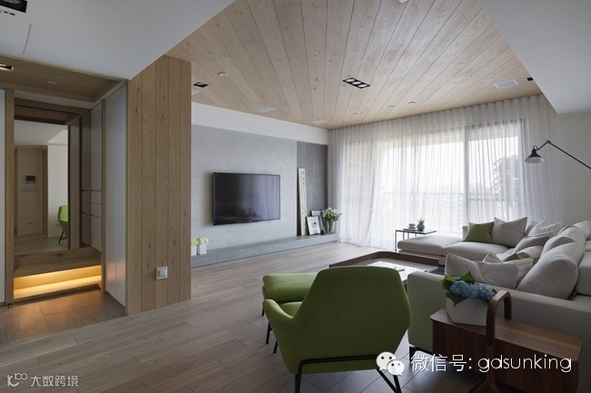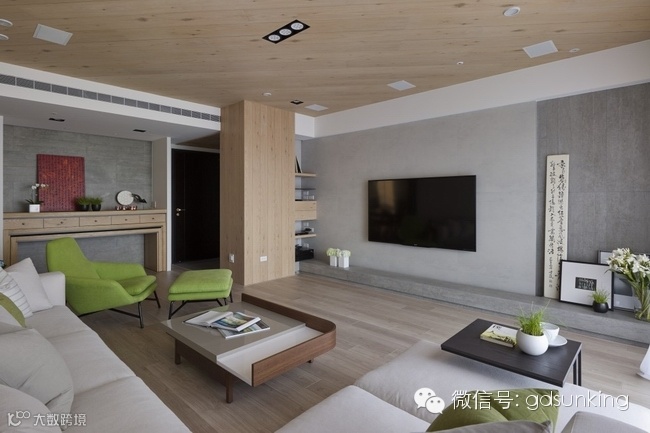 设计过于前卫的风格,并不适合年纪大的老人家和小孩,容易对这些族群造成压迫感。这个案例的风格舒服明亮、清爽宜人,特别重视空间采光,就算不用开灯也光线充足,令人神清气爽。设计师大量运用木头材质以及清水模砖作为表现手法,营造出清淡舒服的居家风格,客厅的家具使用亮绿色,呈现出清新中带着活泼气息的居家环境。