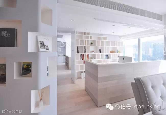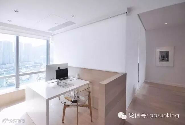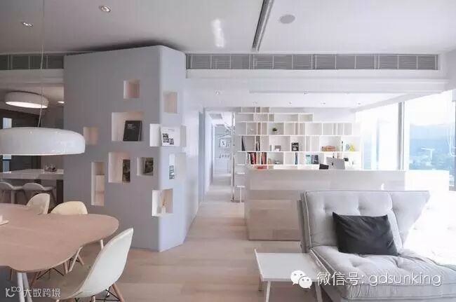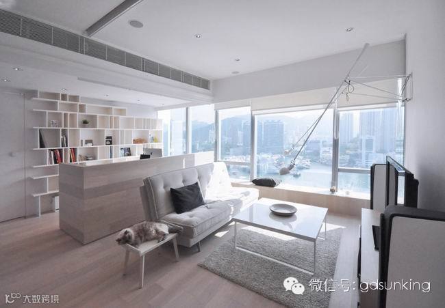 “船屋”公寓:这间位于香港仔南湾,拥有三个卧室的公寓被翻新改造成一个生活、工作、玩耍的空间!新概念是拆卸两个现有隔墙,从而创建出毗邻开放工作室的一个大卧室和大休闲室。设计灵感来源于布列塔尼传统的法国船屋,使用一个连续的带状蓝色墙壁“漂浮”并将所有不同区域联结在一起。浅木地板不仅给人,也给猫带来舒适惬意的环境,巧妙地利用天花板安置白色幕帘,既美观又实用。