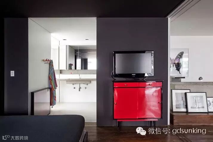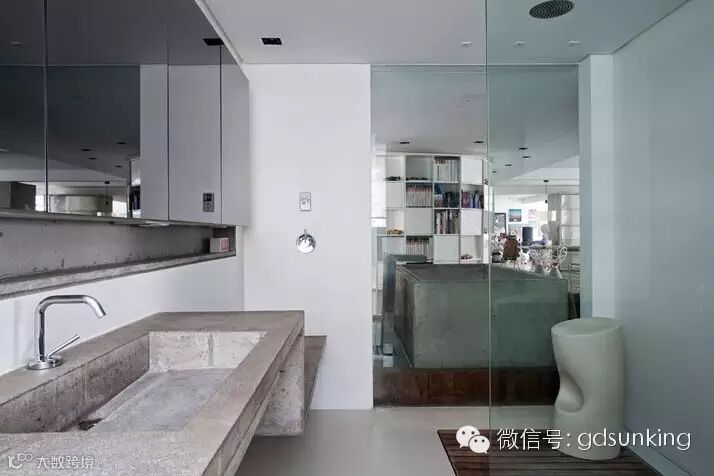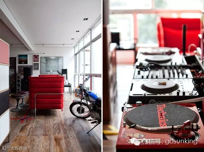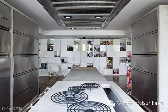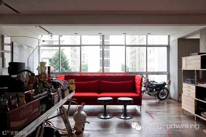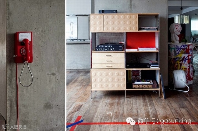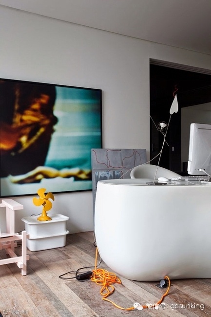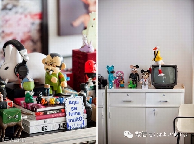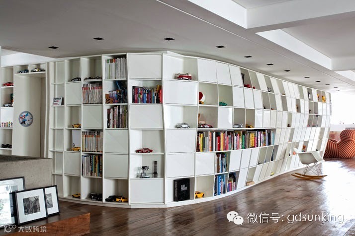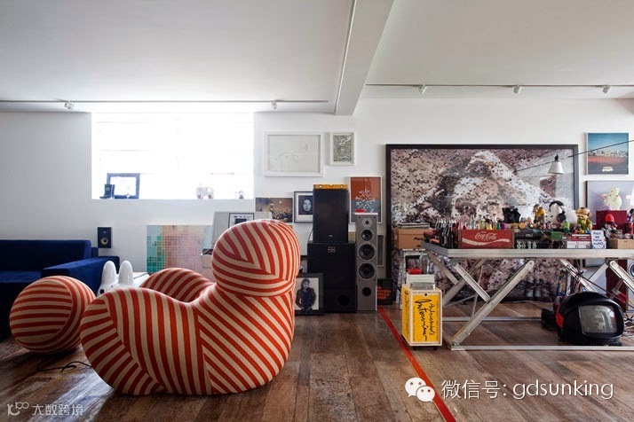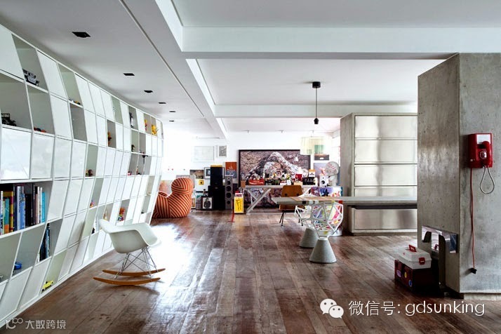 这是巴西圣保罗一家设计店MiCasa的主人Houssein Jarouche的公寓。进门处和室内各个功能区的L型分割界限上打造出了一款巨大的异形书架,电视背景墙部分的收纳展示柜就好像受到来自外界的巨大压力而导致变形挤压了一般。书架旁广阔的空间里,功能区排列顺序依次为客厅,工作室,厨房,卫浴间和卧室。各功能区之间都是由素水泥进行适当分割,实施完全开放式设计。房间里色彩用的并不多,但是各种有趣的装饰潮物却让人眼前一亮。