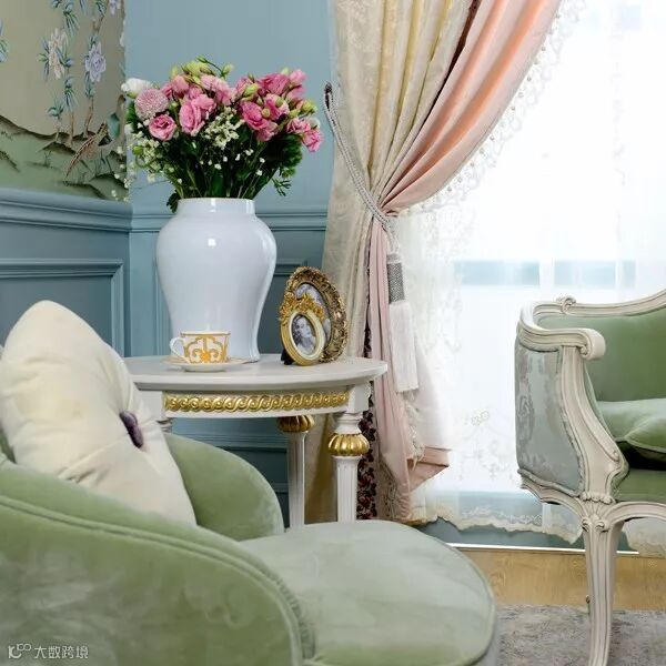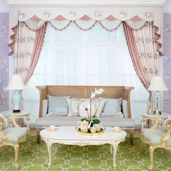 昂~~~ 真是令小编都要少女心炸裂的色调呀,淡粉色的窗帘与窄长的窗户如同少女的窈窕的身姿,橘粉色的地毯有着绚丽的花纹,整个客厅风一吹,清丽澄明,精致唯美……