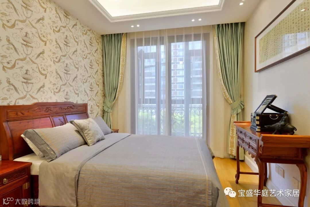 客厅中 ,新中式的家具与法式的窗帘精妙混搭,带来意蕴深远的优雅魅力,令人无限沉沦其中。东西方元素的交融产生出奇妙的视觉体验。