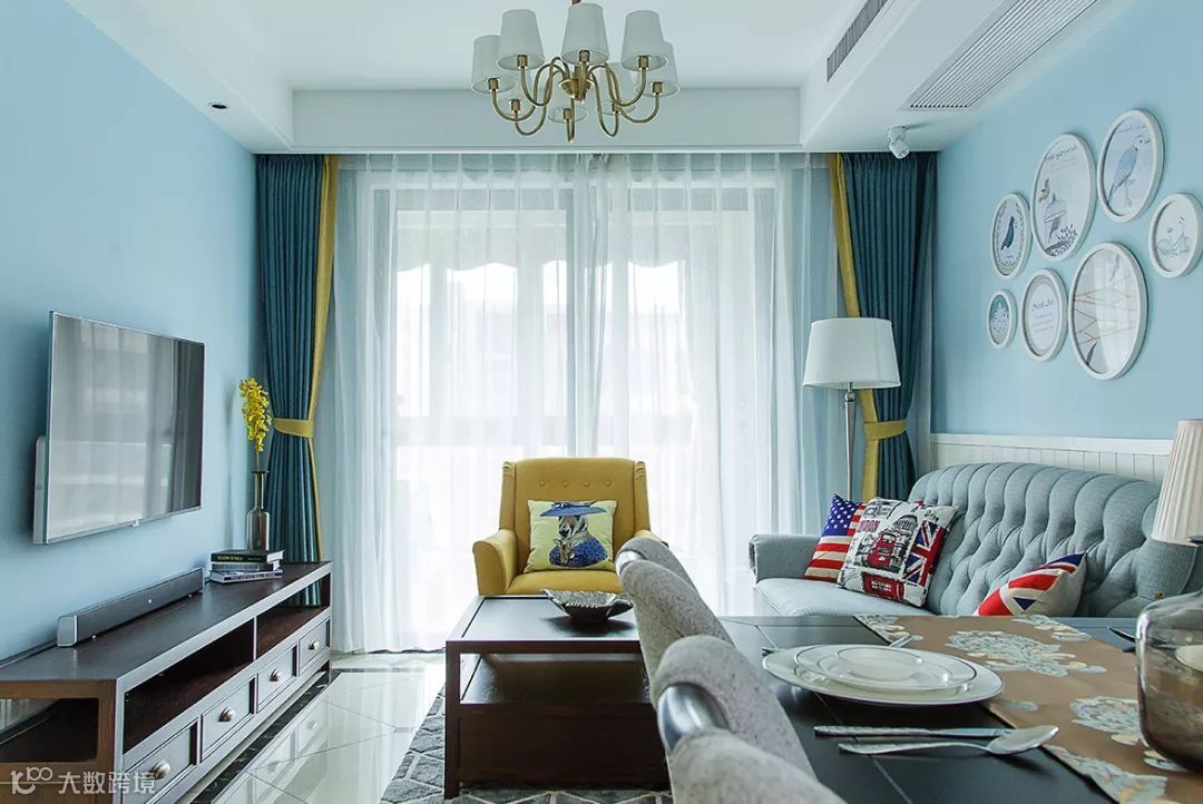 ▲ 蓝色和黄色拼色窗帘,对应单椅和墙面,黄色只用小部分,比例协调