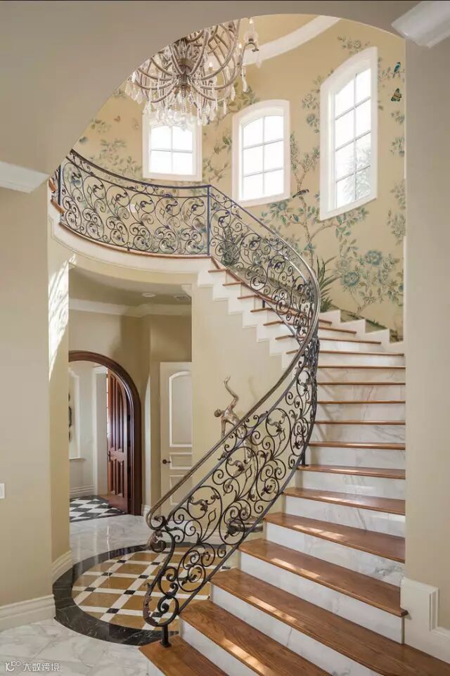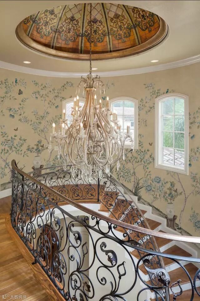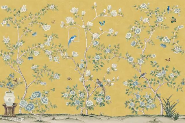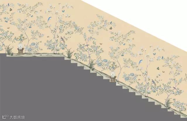 客户选用《雅泾园-07色》这幅壁画,原作中的花鸟必须根据楼梯空间的结构进行重新构图。