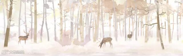客户选用《鹿与林》这幅壁画,但这幅画的比例并不适合沙发背景的尺寸比例,因此需对画面进行调整构图。