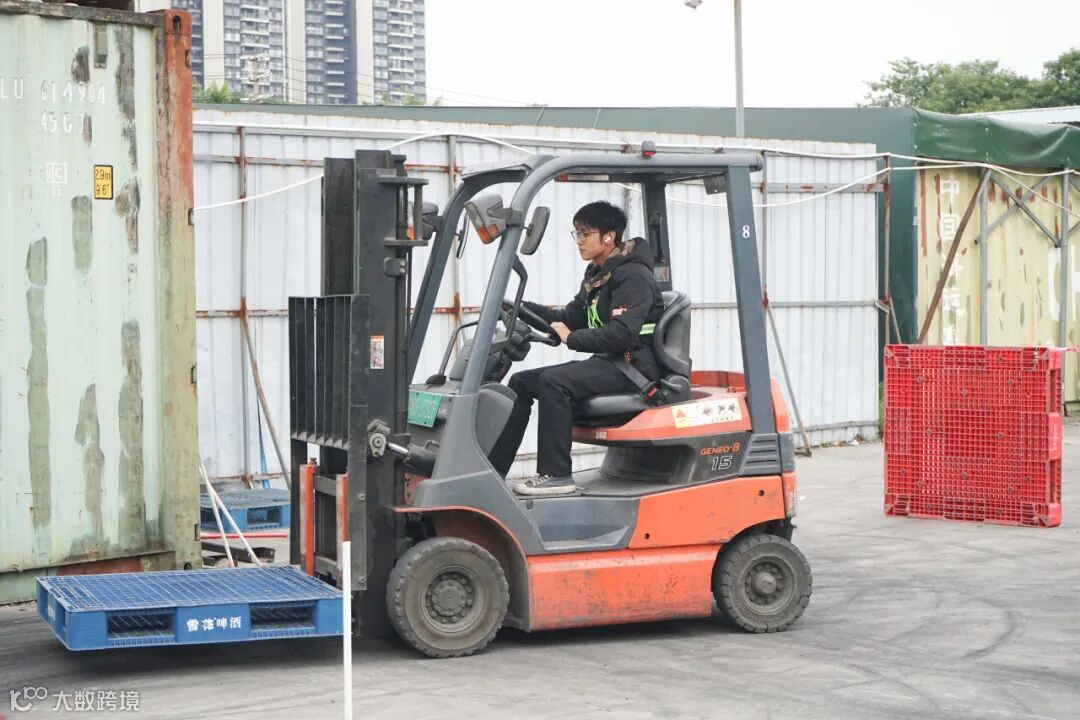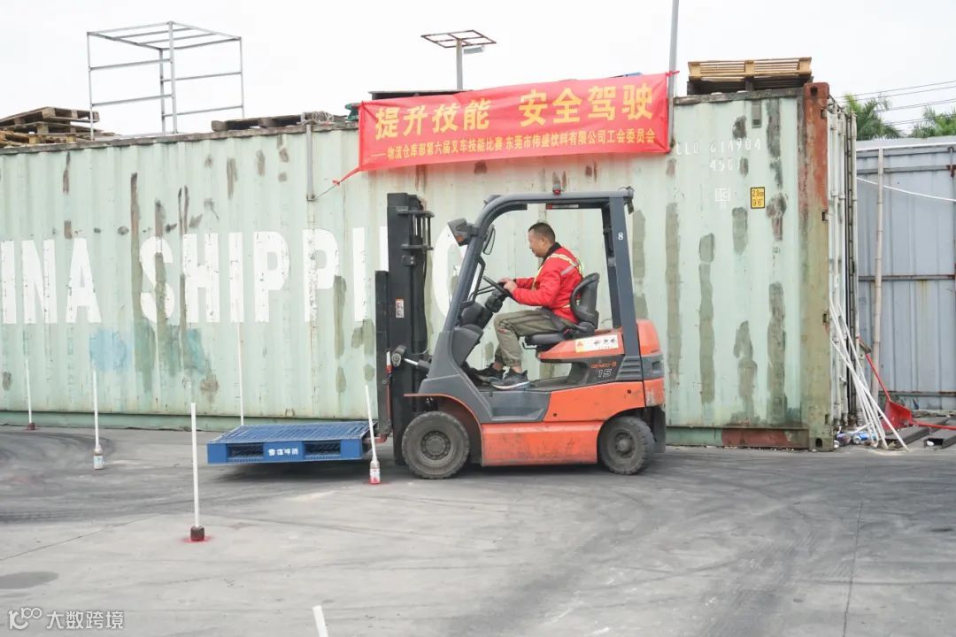 物流仓库部尹经理宣布完比赛规则,实操竞赛正式拉开帷幕。一声鸣笛,叉车启动,参赛选手需要用叉车搬运卡板,在行驶过程中,不能碰到地上的水瓶,用最快的时间将卡板运输到指定的位置。