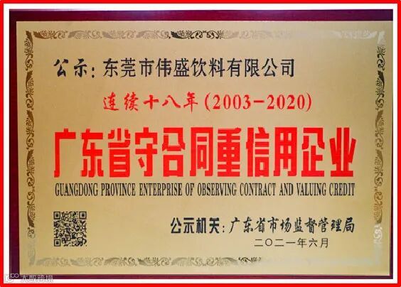 2018年,东莞市伟盛饮料有限公司当选为东莞市守合同重信用企业联合会第一届监事会监事长单位。