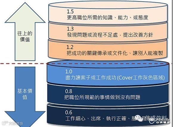 但要更往上升迁,尤其开始进入管理职或是中阶的管理职时,老板考量的就是红线以上的部分。你是否能把知识与流程Share给团队?因为你要当主管,就得要活用团队的力量,而不再是自己做而已,所以你得教出一些人。甚至他还会考虑到,若升你,你是否能有高度,看到问题,并解决问题?或甚至更好,你还能预见问题,并预防问题?