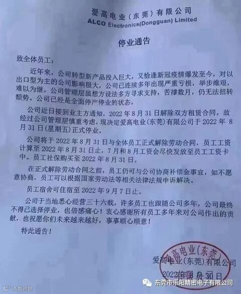 无独有偶,8月30日,爱高电业(东莞)有限公司(下称“爱高电业”)也对外发布了一则《停业通告》称,近年来,公司转型新产品投入巨大,又恰逢新冠疫情发生至今,对以出口型为主的公司影响极大,公司已连续多年出现严重亏损,举步维艰,难以为继。公司管理层虽想方设法寻求支持,苦撑数月,仍无法扭转颓势。公司已经是全面停产停业的状态。