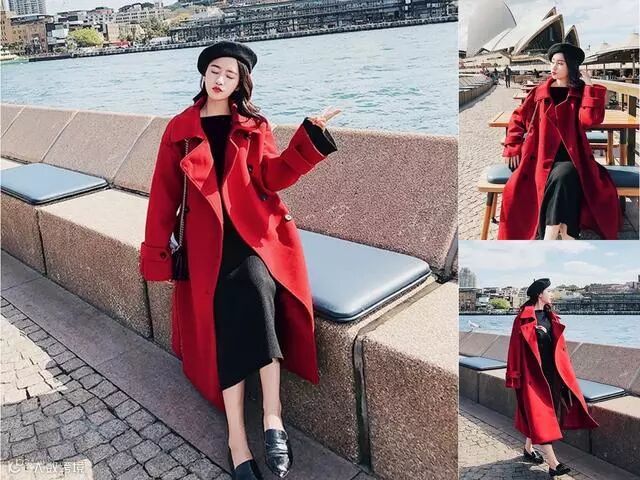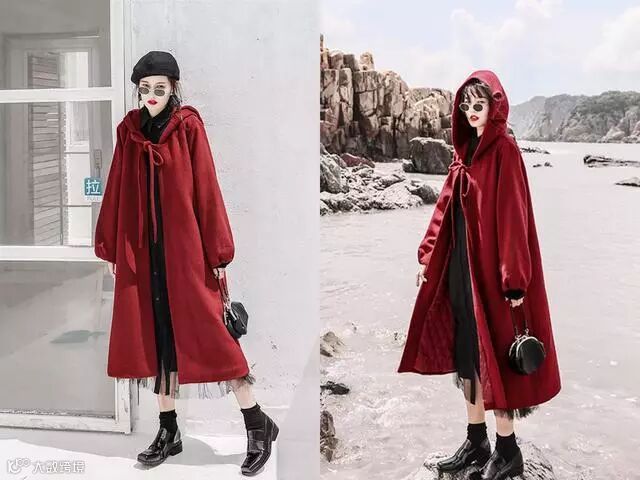 搭配2:红色就是和黑色搭配在一起,是最美百搭的颜色组合了,换上这件超级有气场的斗篷式红色大衣就很不错,瞬间就让你整个气质都展现出来,相当的时髦有范儿,这寒冷的冬天这么穿不仅仅是温暖,还特别的吸睛,回头率超级高的哦,这种红色的大衣穿上身也太美了吧!
