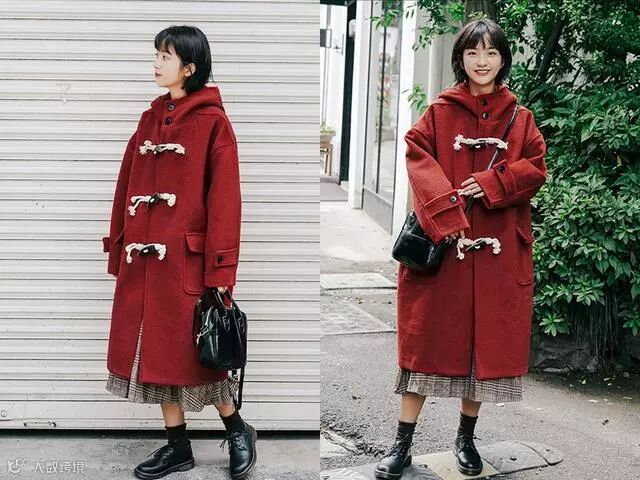 搭配1:要冬天的穿搭亮眼的话,选择这件牛角扣红色大衣就很不错,首选颜色上面就已经够抢眼了,里面搭配深色系的百褶裙子和黑色鞋子,根本就不会抢到红色大衣的光彩,只会起到辅助的作用,这么穿又暖又时髦,太美了。