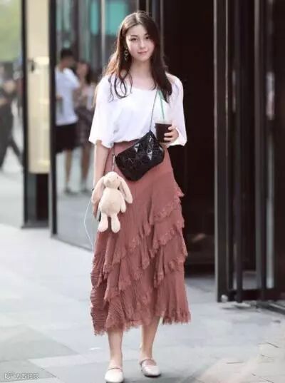 白色的上衣,再搭配红色的百折裙的时候,本身就是具有时髦感的搭配,并且在选择包包的时候还加上了一个兔子的配饰的一个配饰,对于人来说是非常好的选择,可以让人的搭配增添光彩。