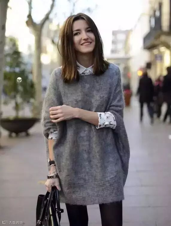 灰色宽松毛衣搭配花纹衬衣,不但美还可以藏肉哦!