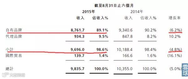 截止2015年8月中报,鞋类产品营收情况如下:代理品牌、国际贸易占比均很小,自有品牌占了近90%,营收出现同比下滑。