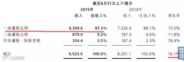 截止2015年8月中报,代理运动服饰产品营收情况如下:一线品牌占大头,整体增长率达到16%。