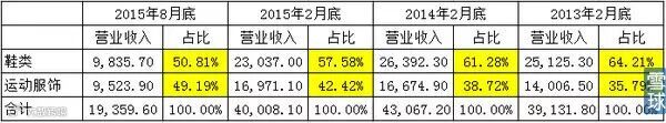 如果回顾三年来看,鞋类产品营收在2014年开始下滑,占比也在逐渐下降,运动服饰产品一直有稳定上升,营收占比在逐渐上升,如下: