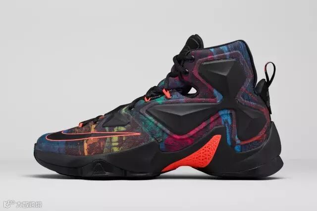 这看上去有些多彩,但实际仍是以黑色为主。作为一双篮球鞋,高帮的设计能够做到更好的对脚踝的保护,侧面不规则的切割有了更多的未来感,包括鞋底花纹也采用了非常规的六边形设计,而lebron的标志则被放到了鞋尖处。
