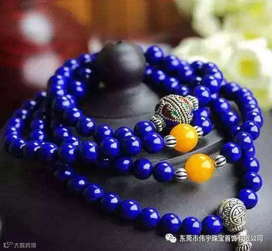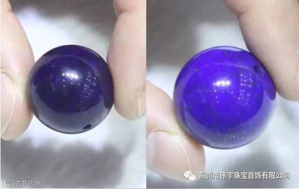 教你识别:如果是青金石珠子,注意看孔道,假冒的青金石孔道非常光滑,还会有凹陷感,真正的青金石孔道口经常会有细纹的裂纹;用强手电打光,石英岩假冒的青金石会透光,而且能看到它的颗粒结构,真正的青金石打光后是不会透光的。