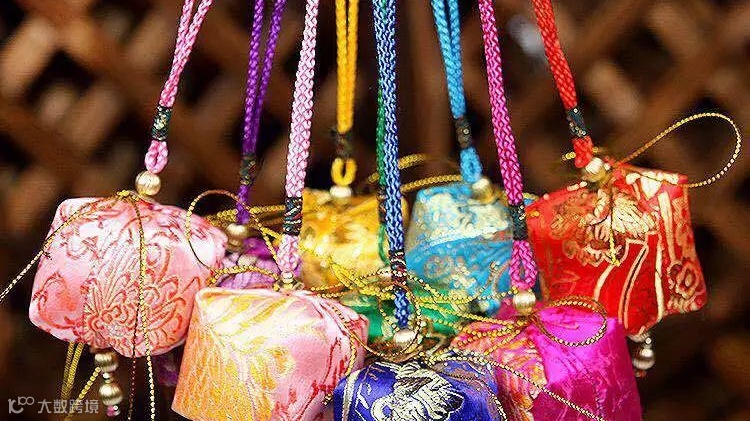 端午节小孩佩戴香囊,不但有避邪驱瘟之意,而且有襟头点缀之风。香囊内有朱砂、雄黄、香药,外包以丝布,清香四溢,再以五色丝线弦扣成索,作各种不同形状,结成一串,形形色色,玲珑夺目。