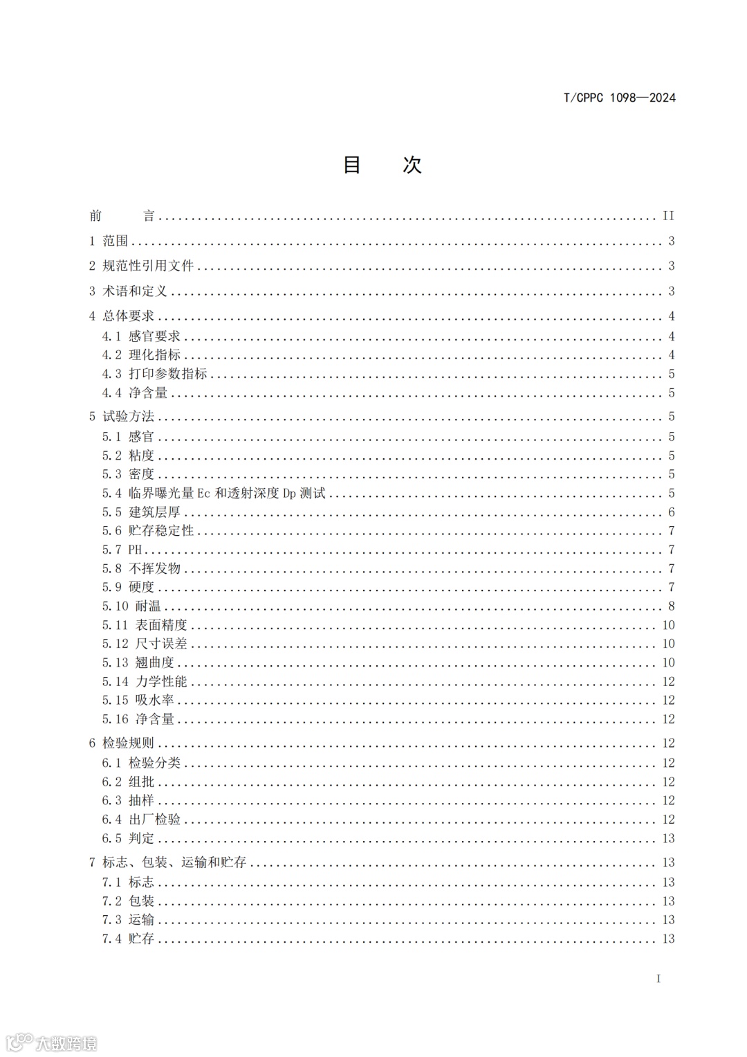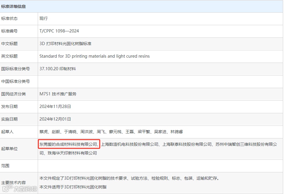 2024年12月13日,由中国生产力促进中心协会发布的T/CPPC 1098—2024《3D打印材料光固化树脂标准》正式通过审核,现已实行。