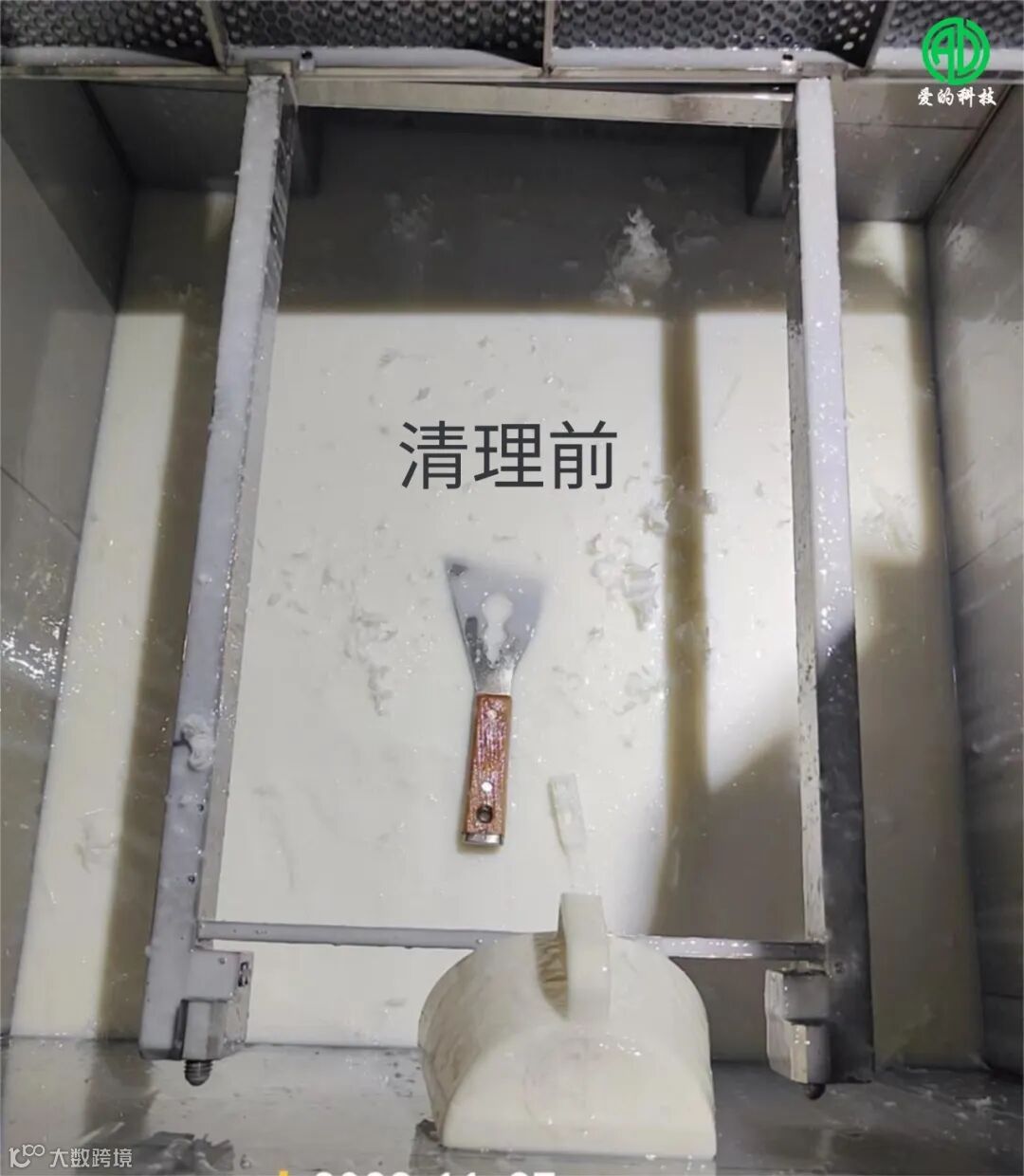 收到客户需求后,爱的科技售后人员便带着新材料,马不停蹄赶往王总公司。等到王总的公司对设备进行简单的检查发现,材料已经非常粘稠并且底部有大片的硬化,大有整槽材料硬化的趋势,王总表示,希望一天内就将材料更换好,客户订单非常赶时间。