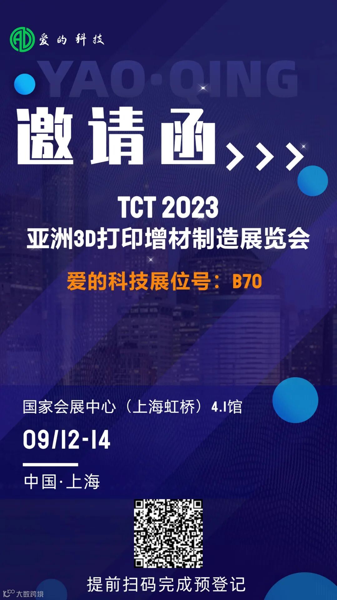 2023年9月12日-14日,东莞爱的合成材料科技有限公司诚挚的邀请您莅临上海国家展览中心(上海虹桥)4.1馆 ,B70展位。共同构建3D打印与增材制造思维,欢迎扫描二维码完成预登记。