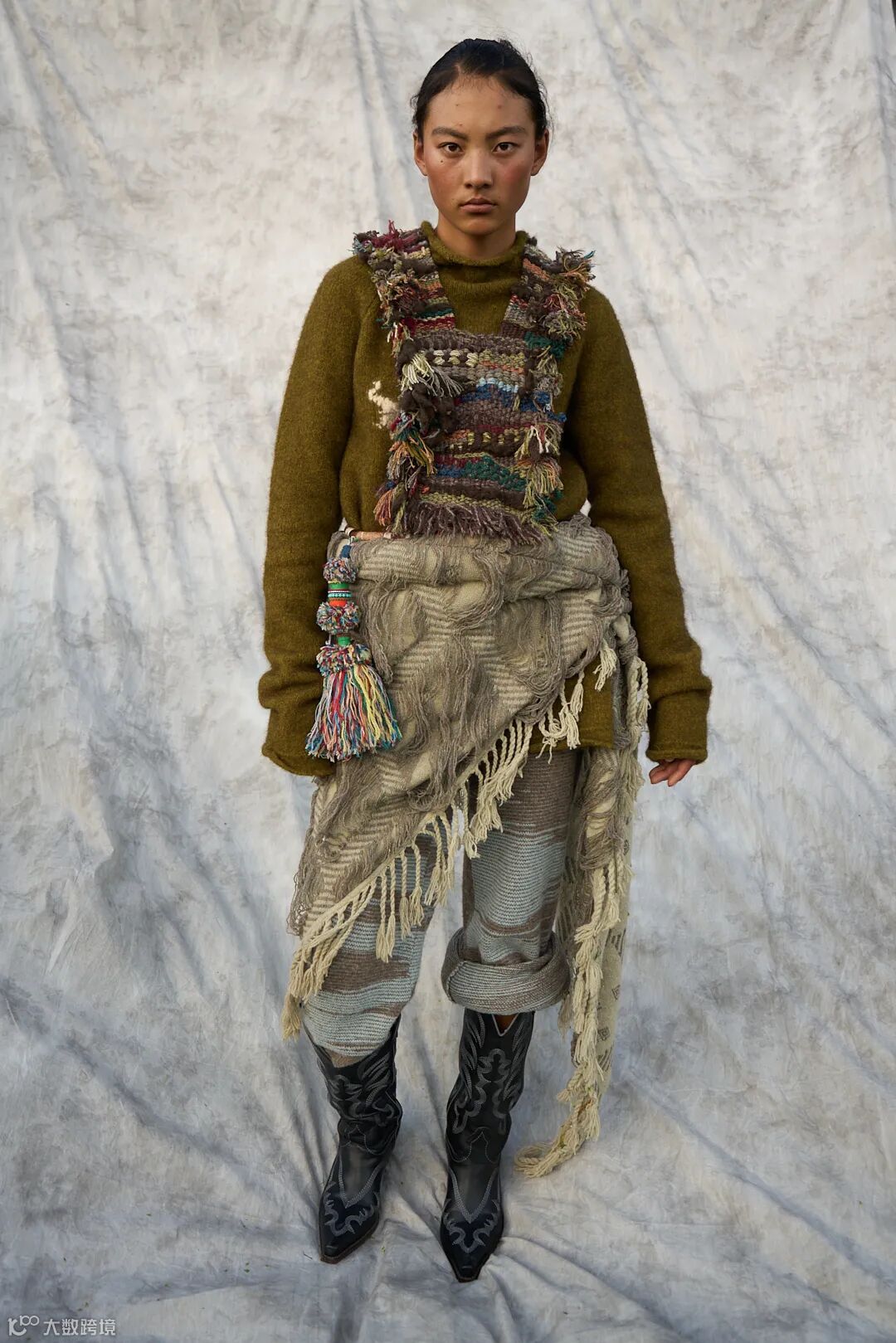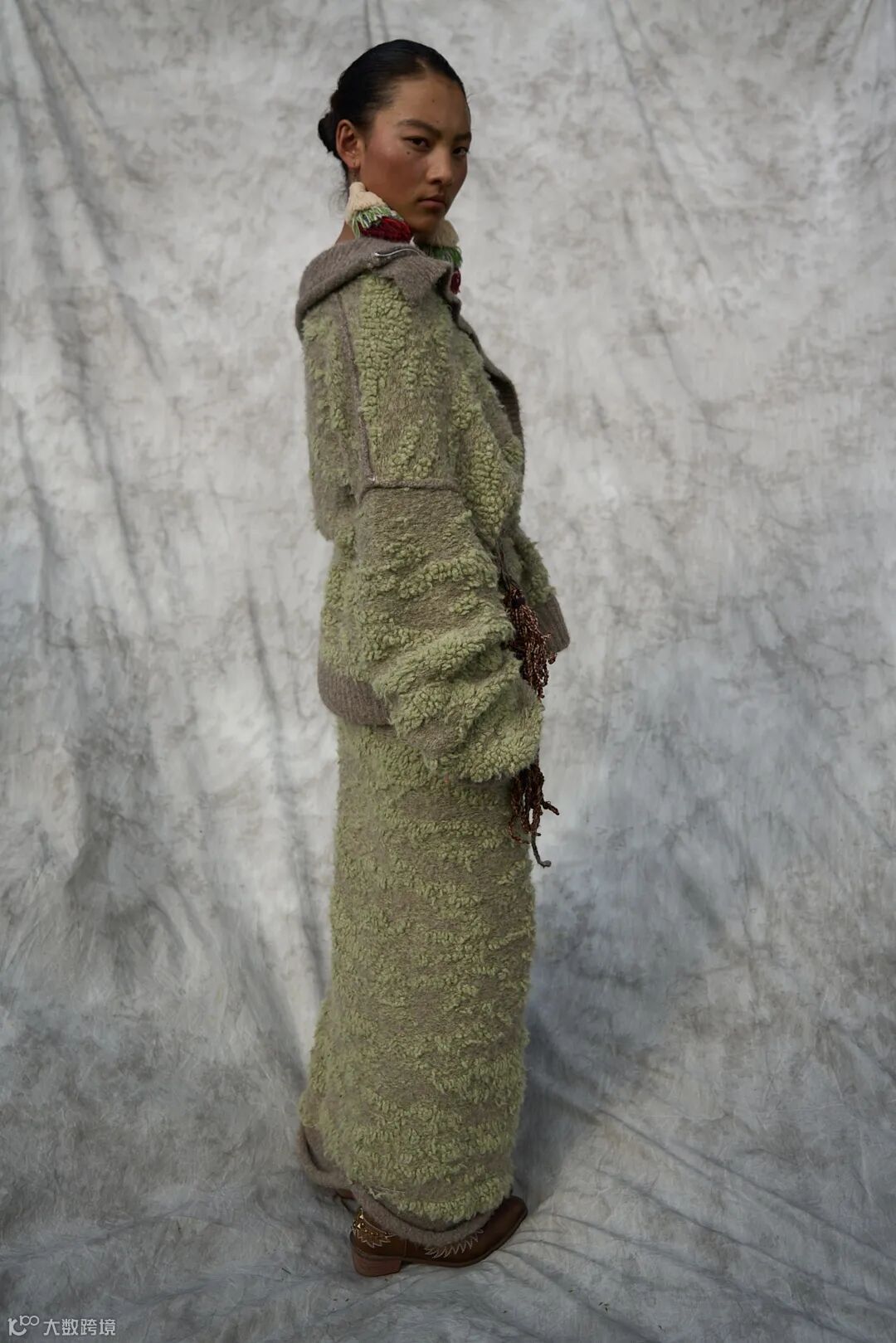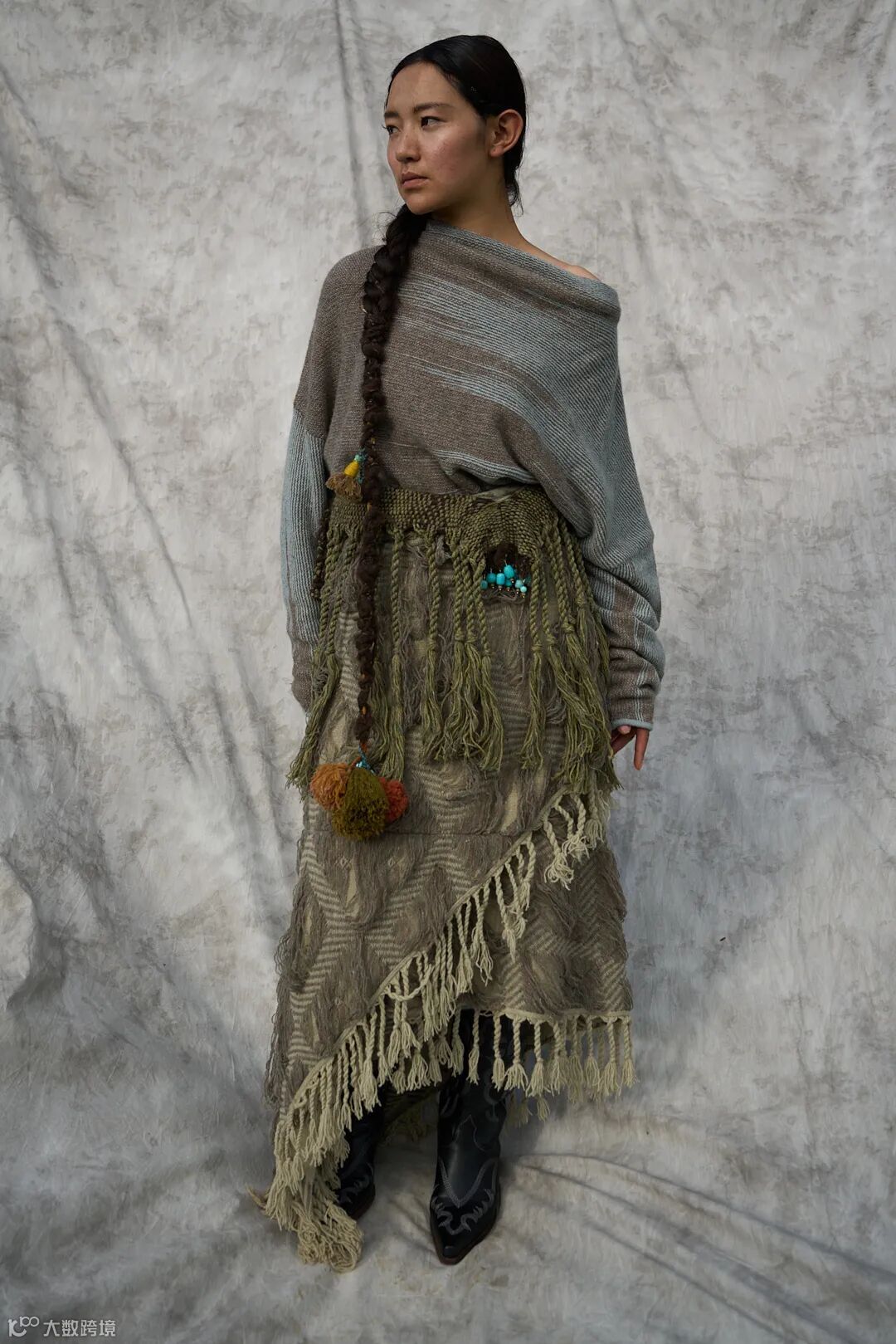 我们用毛织来承载这份信念,将玉树的自然与人文意象转化为设计语言:画出玛尼堆、草原、河流与牦牛做针织图案,解构藏袍与披挂做廓形,创作出这个致敬土地与人的针织系列。