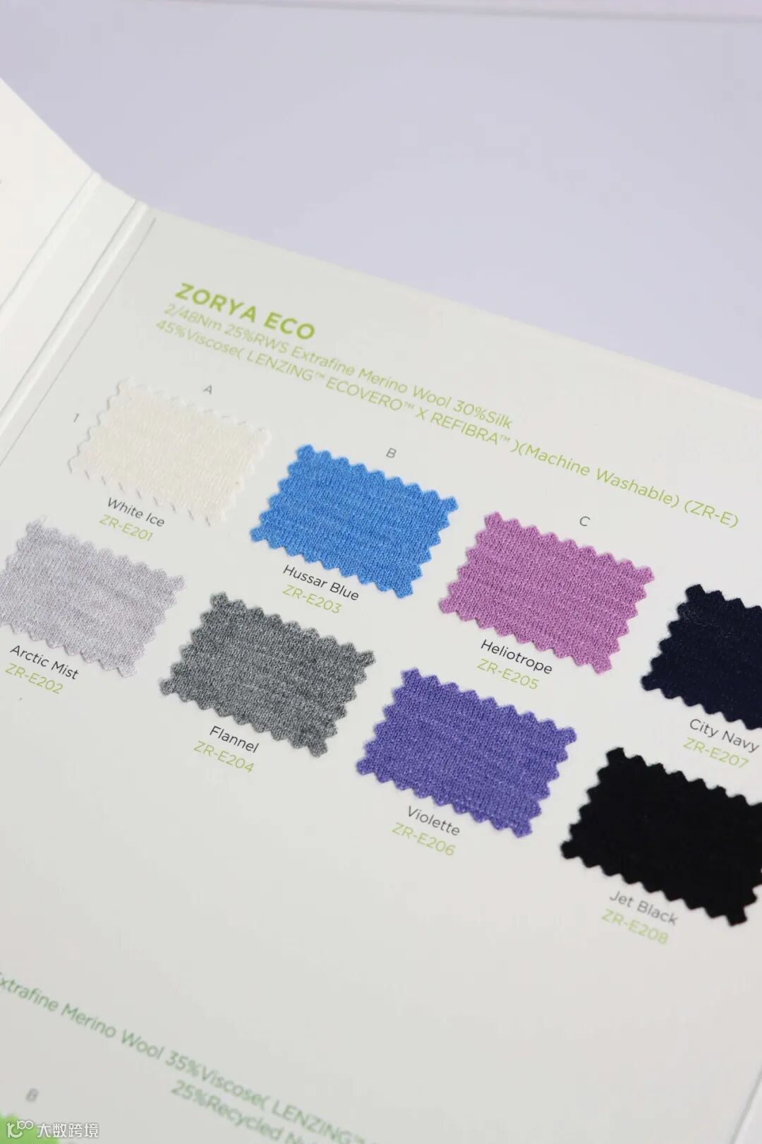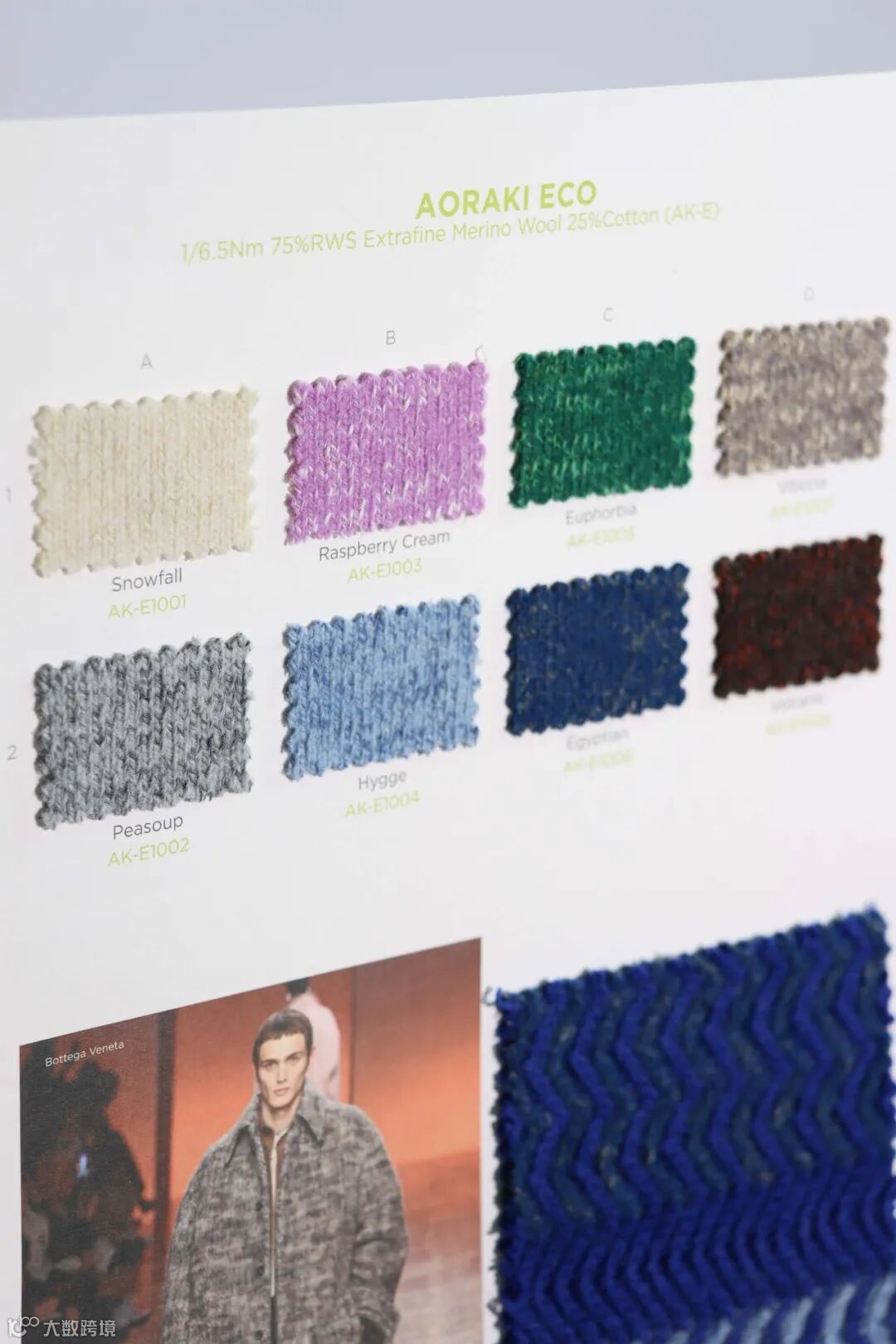 霜痕 ECO 纱线由两款不同粗细的纱并线而成,呈现出粗细结合的独特效果。整体布片因此具有动态变化的混色特征,推出的8个颜色系列均充分展现了这一变化,为针织单品增添了丰富的视觉层次。