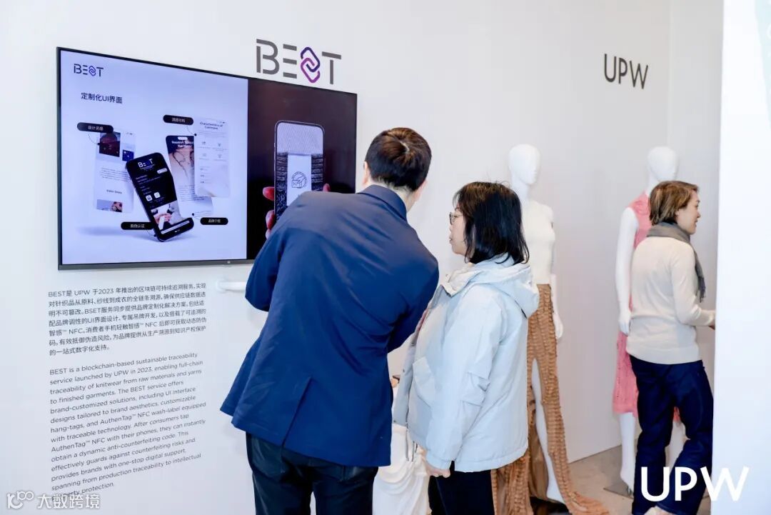 而 BEST 服务,我们也特别设置了独立展示区,通过防伪水洗麦与专属吊牌的形式,向来宾深度解读这一系统的运作逻辑。每一枚洗麦、每一张吊牌,不仅是 UPW 纱线的身份认证,更是一份可追溯的品质承诺。来宾在现场近距离观察这些细节载体,了解它们如何帮助品牌实现从纱线到成衣的全链路溯源与价值传递。展区现场交流不断,许多客户对这一兼具专业性与可信度的服务体系表现出浓厚兴趣。