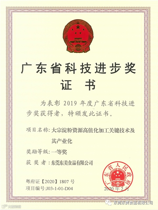 我司参与的《大宗淀粉资源高值化加工关键技术及其产业化》科技项目荣获2019年度广东省科技进步一等奖。