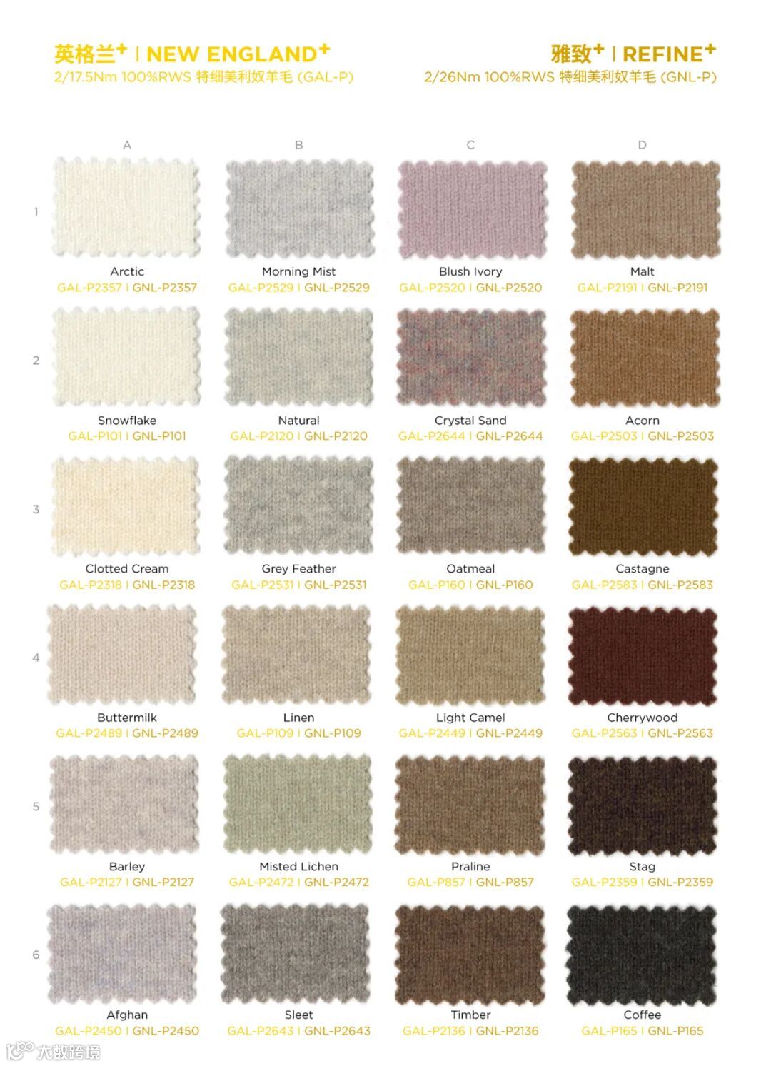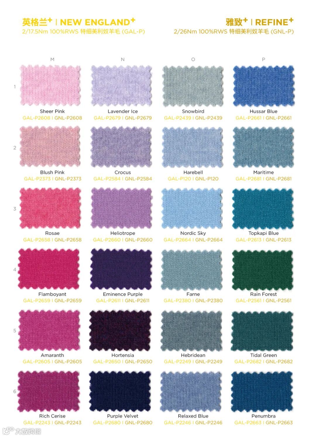 新的颜色组合可以从英格兰+色卡中挑选1个颜色的单纱,和乌尔默色卡中挑选1个颜色的1/26Nm单纱进行加捻。