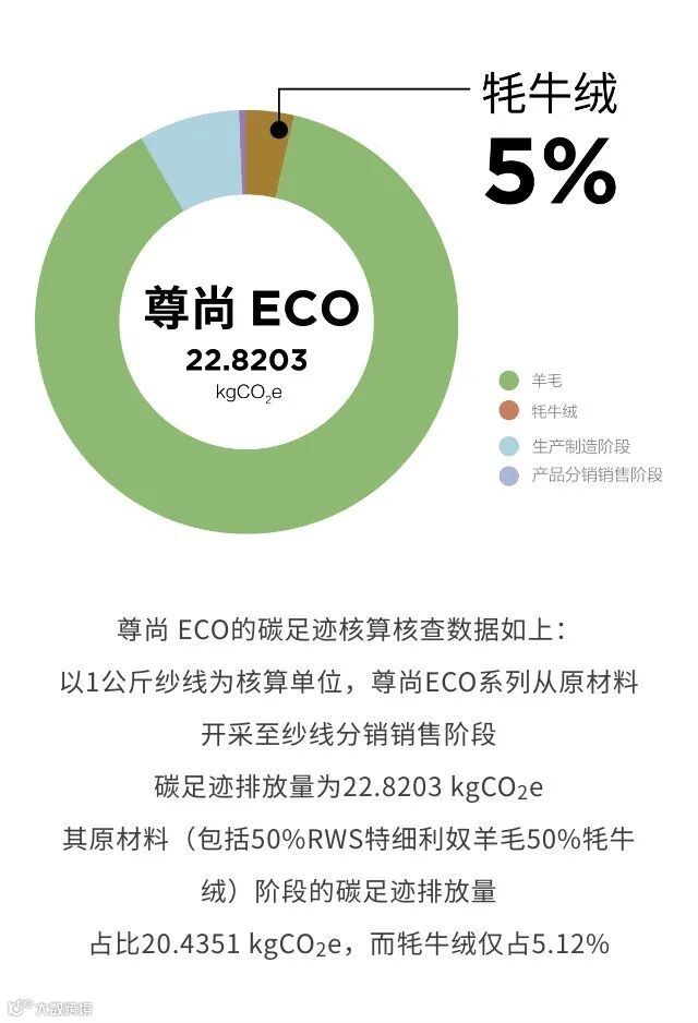 UPW 在 2022 年已经完成 10 款核心纱线的碳足迹认证,在尊尚 ECO的碳足迹核算核查数据中,牦牛绒在原材料阶段排放的二氧化碳占比最少,在环保方面更为优胜。