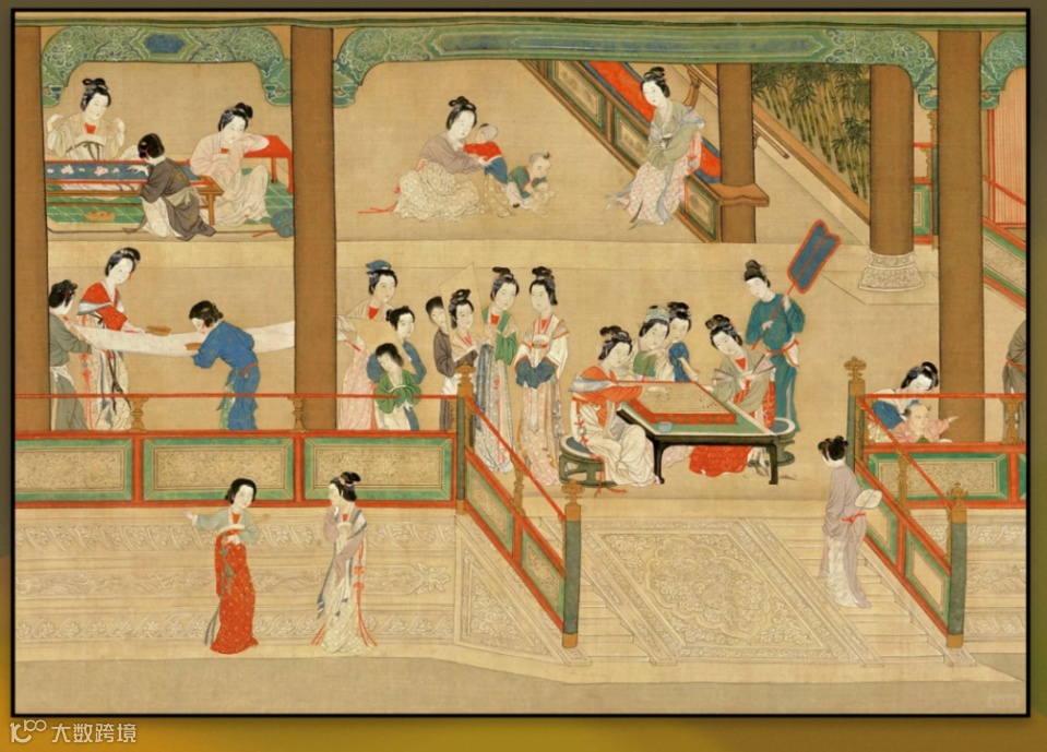 《汉宫春晓图》以人物长卷画、工笔重彩的笔法
