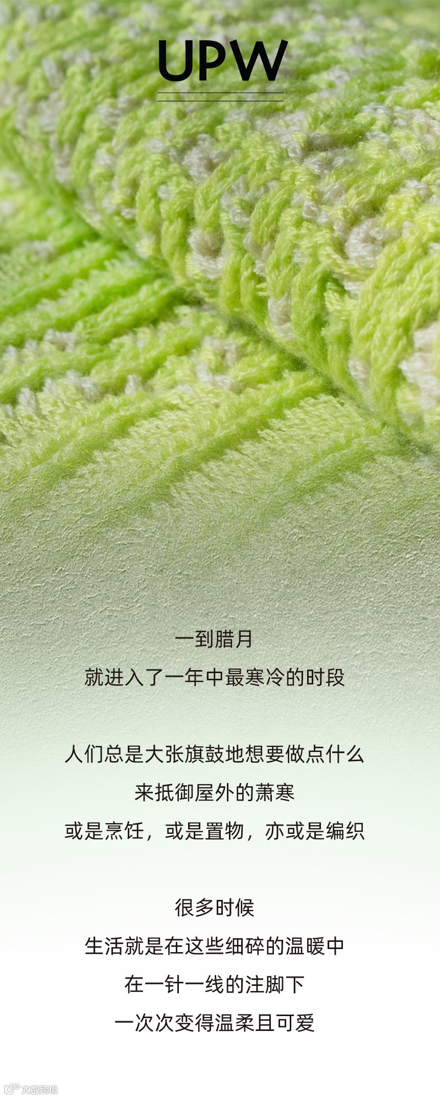 “纱线,就像生活的纹理,交织着温暖与爱。”——Emily Dickinson。UPW愿你与纱线结下温暖的缘分,用双手编织出美好的未来,在这个冬天,让UPW与你赓续温暖的故事,传递无限的爱与关怀。
