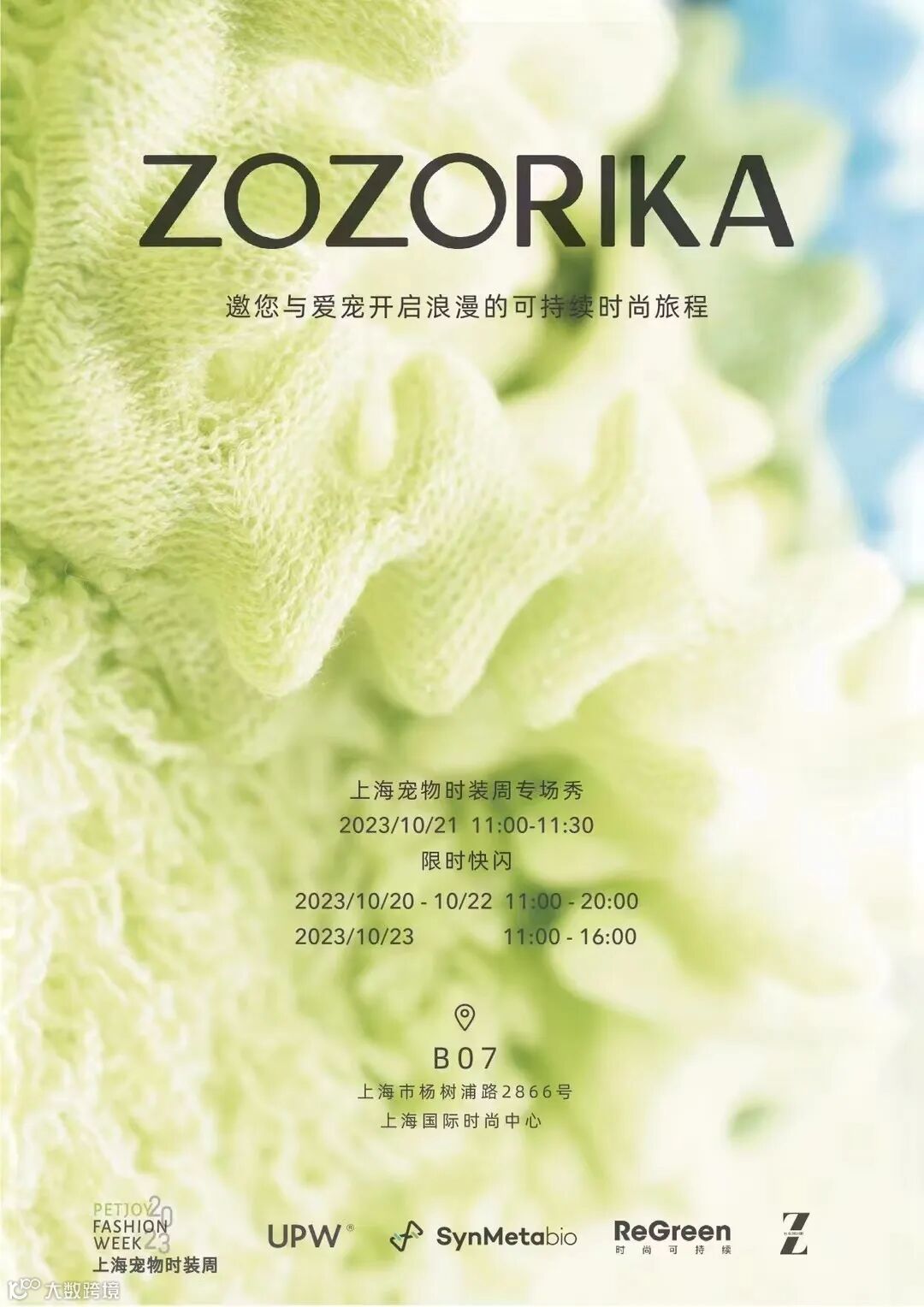 2023年10月20-23日,PETJOY主题活动在上海国际时尚中心举办,聚焦“宠物时尚”新视角,为宠物时尚行业发展开启“加速度”。在本次活动中,处在时尚制造上游的纱线供应链企业UPW携手合作可持续宠物服饰品牌ZOZORIKA,登陆PETJOY上海宠物时装周版块,带来爱宠专场秀以及限时快闪活动,开启关于温暖宠物服饰语言的新“视”界探索。
