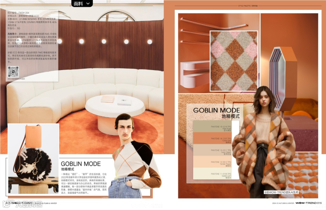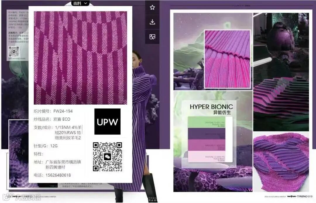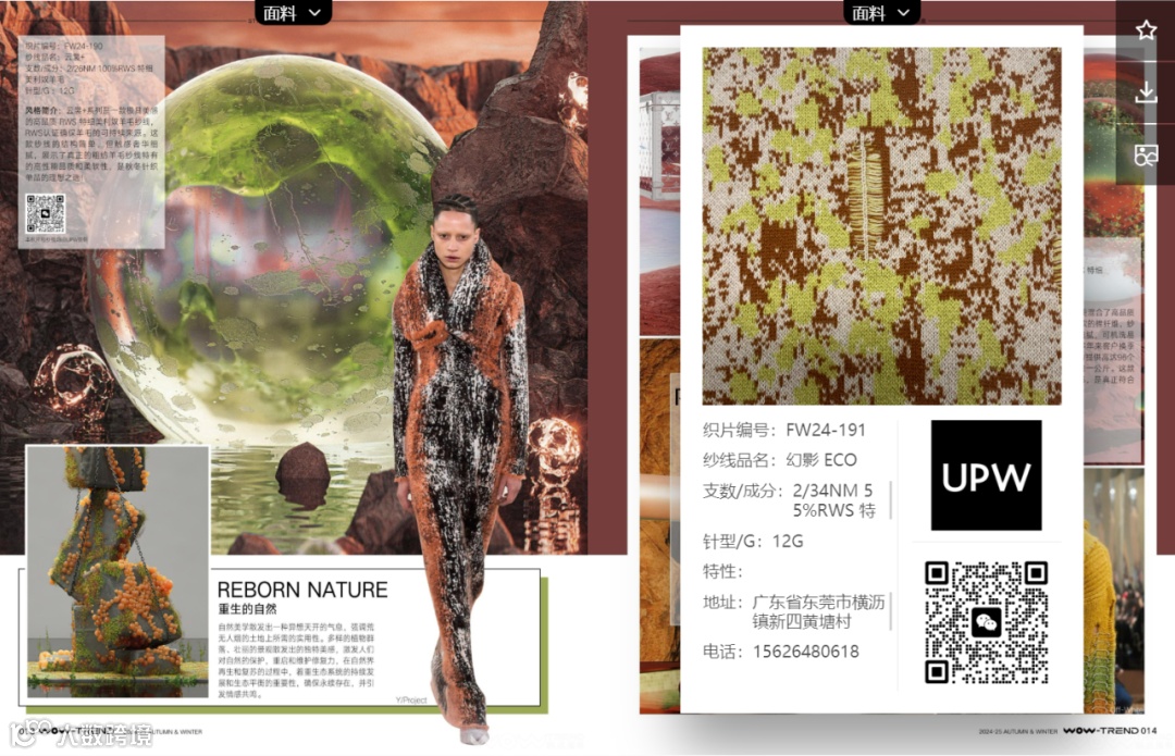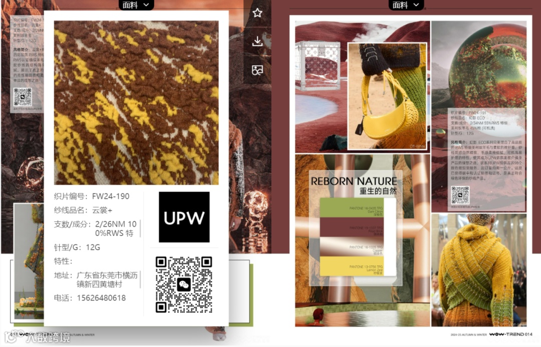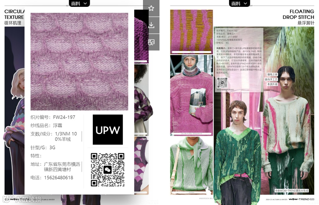 其中,需要特别介绍的是2024/25秋冬「风格色盘」和「关键织片」两大板块,UPW在与WOW-TREND联合趋势研判下,倾心制作的纱线织片集中呈现在这两个主题中。