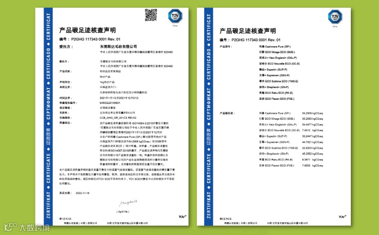 这一核查由国际权威核查机构TÜV南德依据标准ISO 14067:2018进行,流程涵盖纱线产品的生命周期系统边界,即从原料获取与加工阶段至产品分销销售阶段,以及各个阶段中涉及到的运输、生产辅料以及废弃物的处理过程中产生的温室气体排放量。在经过一系列严格核验后,上述十款纱线产品均由TÜV南德确认顺利通过标准认定,获得碳足迹认证,并被颁发授予碳足迹标签: