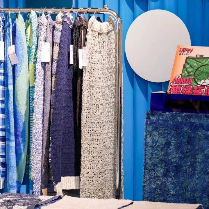 值得一提的是,本次活动现场的针织服装是由先锋独立设计师品牌ANGEL CHEN的创始人陈安琪亲自操刀;展区所展示的创意针织片则是由青年设计师丁罕青所设计。