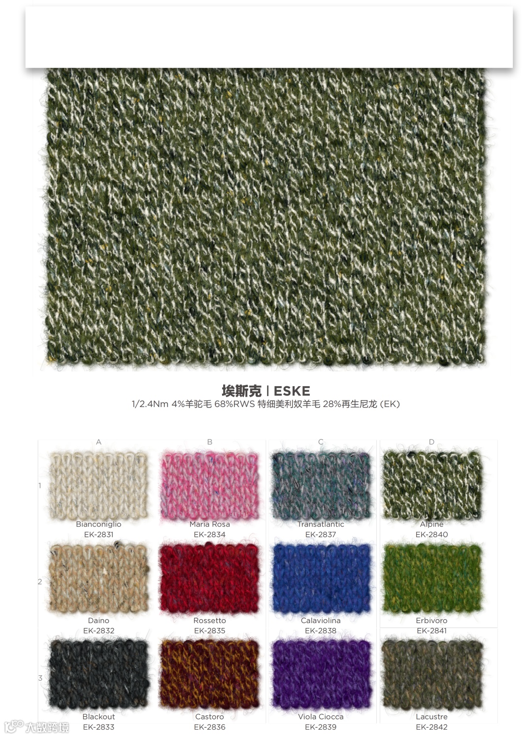 埃斯克系列是一款外观蓬松舒适,手感轻柔,表面有少许彩点效果的美丽新纱线。这款纱线是经典针织品的理想选择,可以为任何衣柜增添色彩和个性。埃斯克系列由RWS特细美利奴羊毛、羊驼毛和再生尼龙制成,适合3针规格织物。