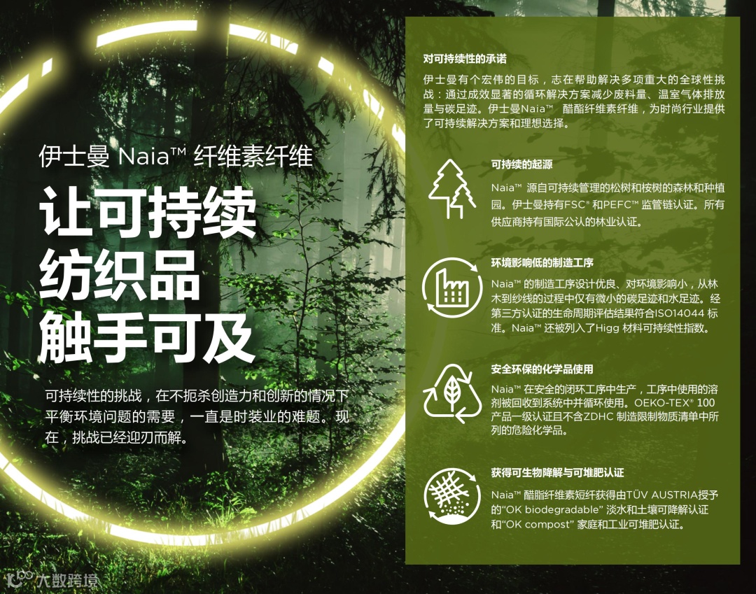 Naia™醋酯纤维不仅制造工序设计优良,对环境影响小,从林木到实现的过程中仅有微小的碳足迹和水足迹,此外,通过安全的闭环生产工序,也有效地减少了废料量、温室气体排放量与碳足迹,为时尚行业提供了可持续解决方案和理想选择。