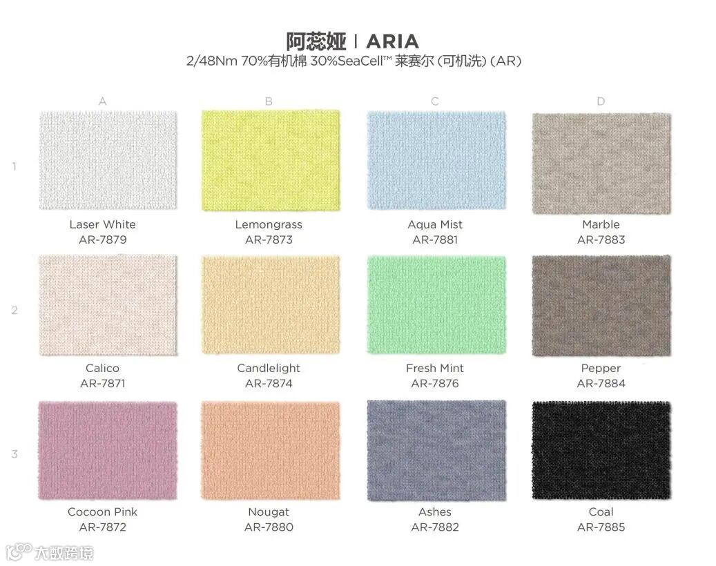 阿蕊娅由有机棉和SeaCell™海藻纤维混纺而成,含有机棉高达70%的系列纱线,质感柔软透气、极富层次感。