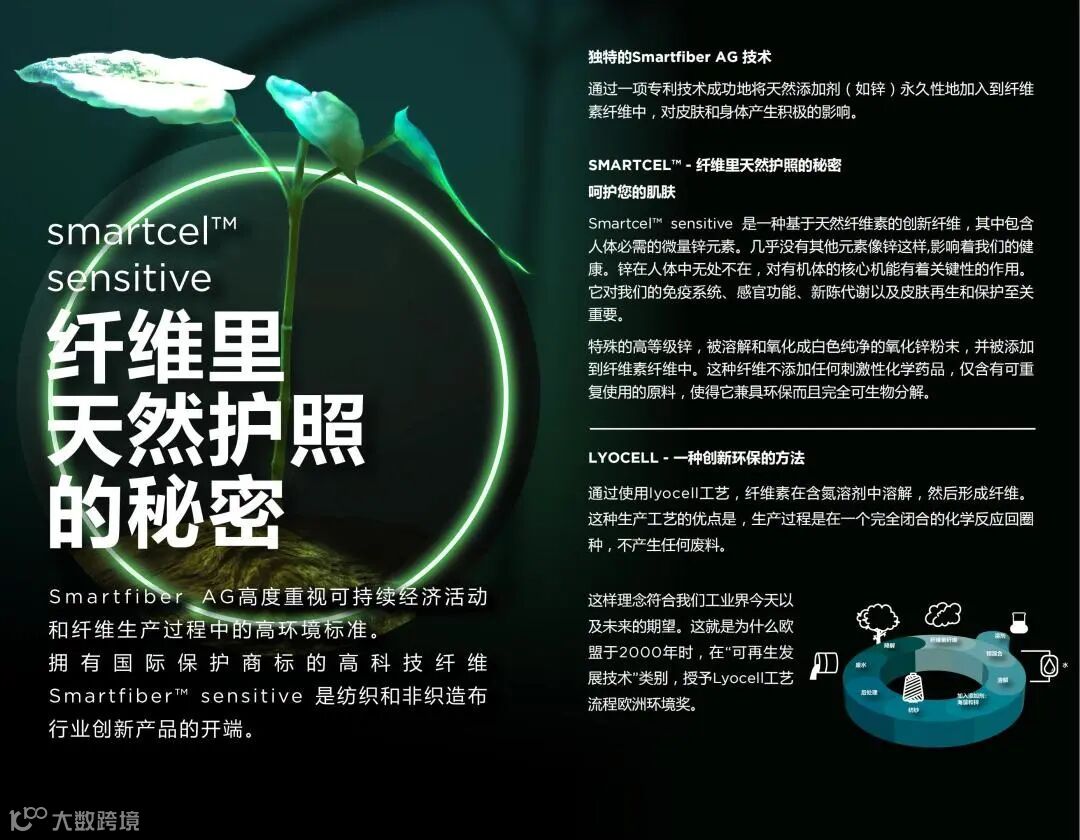 拥有国际保护商标的高科技纤维Smartcel™sensitive莱赛尔是纺织和非织造布行业创新产品的开端,这是一种基于天然纤维素的创新纤维,其中包含人体必需的微量锌元素,它对人体的免疫系统、感官功能、新陈代谢以及皮肤再生和保护起着至关重要的作用。